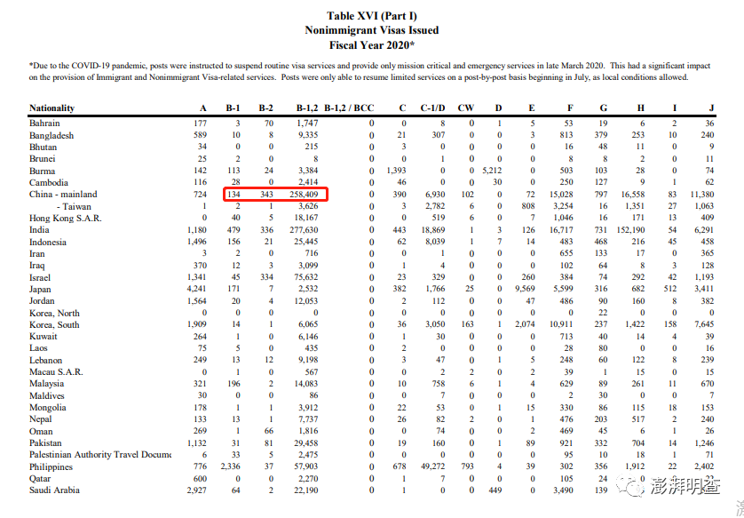美国旅游局在其官网上公布的另一份有关各国(地区)各种类签证签发数的文件则显示,在2020财年内,美国一共向中国大陆派发了134份B-1类签证,258409份B-1/B-2类签证,以及343份B-2类签证。