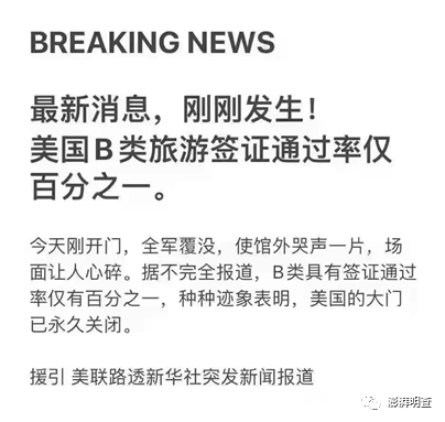 11月11日前后,中文网络流传起一张截图消息,称根据新华社、美联社和路透社突发新闻报道,中国赴美旅游的B类签证通过率极低,仅有1%,“美国的大门已永久关闭”。