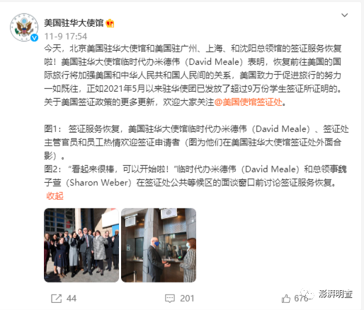 “美国非常欢迎中国留学生、游客以及商务人士,美国重视并支持中美两国人文交流。”11月9日,美国驻华使馆临时代办米德伟在回答记者提问时说。