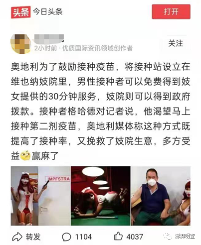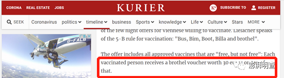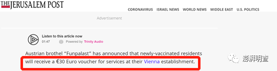 近日,中文社交平台上流传一则消息,称奥地利政府为鼓励接种新冠疫苗,将疫苗站设在维也纳妓院内,男性接种者可免费得到30分钟服务,妓院则可以得到政府拨款。
