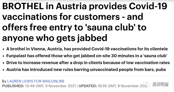 维也纳一妓院作为新冠疫苗接种点,现场接种后可获得一张代金券,兑换30分钟免费桑拿服务。