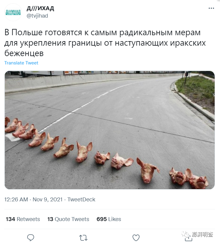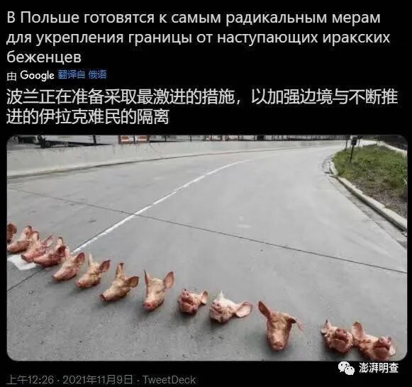 一张在互联网上被广泛传播的推特截图声称,“波兰正准备采取最激进的措施,以加强边境与不断推进的伊拉克难民的隔离”,随文附上了数个猪头被整齐排放在空旷街道上的图片。