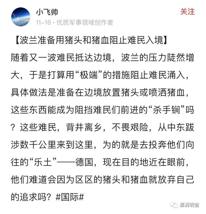 随着白俄罗斯与波兰边境的难民危机持续发酵,近日来,国内社交平台上流传一种说法,称波兰打算在边境放置猪头、喷猪血,以阻挡中东难民进入波兰。