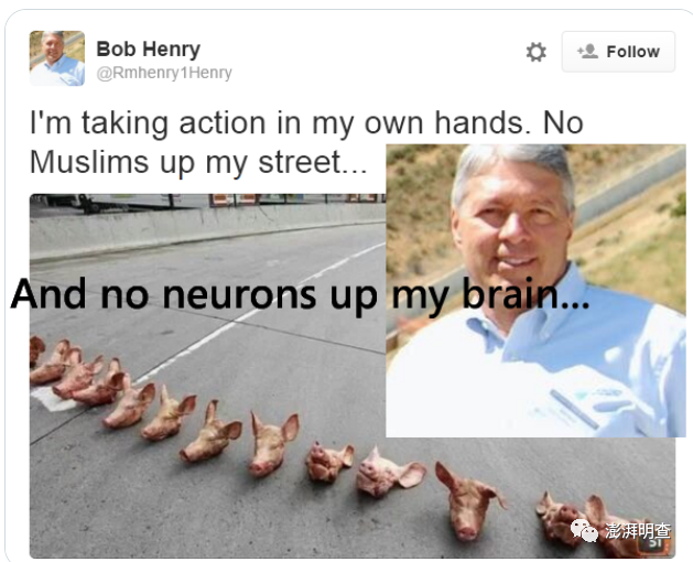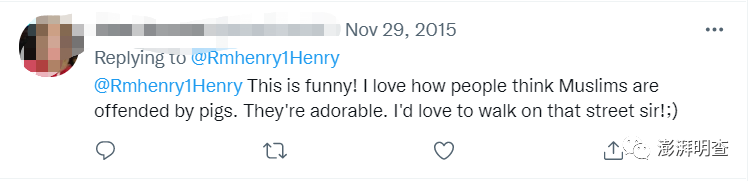 经核查,@Rmhenry1Henry的账号已于2020年被冻结,相关链接也已失效,但推特上保留了大量推特用户对@Rmhenry1Henry相关推文的回复或评论,内容涉及“猪(pigs)”、“猪头(pig heads)”、“街道(street)”等词汇。