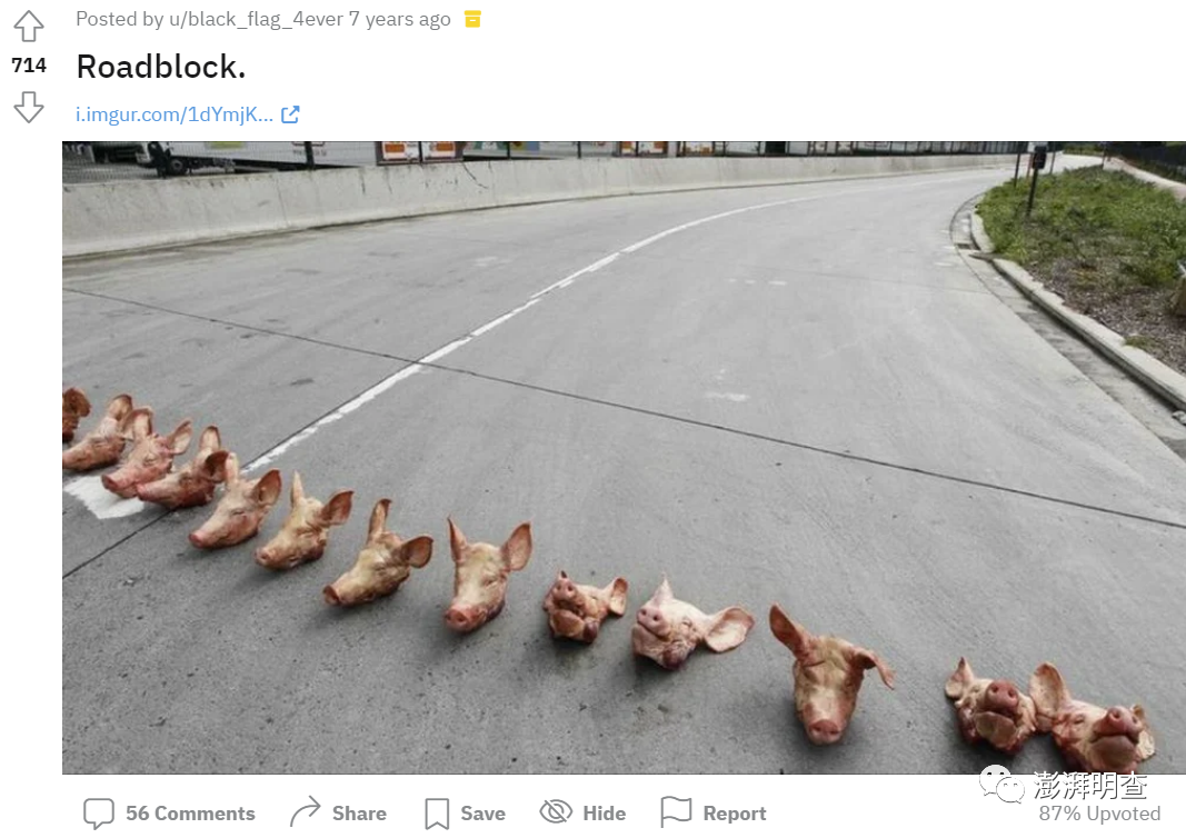 使用Tineye对该图片进行反向搜索后发现,该图片最早出现在2014年,由一位名为u/black_flag_4ever的用户发布在欧美社交网站Reddit上,但仅配文“路障”(Roadblock)一词,没有其余说明。