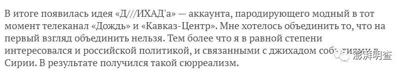 在一篇发表于2016年的报道中,@tvjihad创始人曾表示,该账号结合了高加索中心和“雨”电视台的特点,是对二者的模仿。