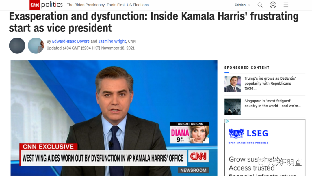 2021年11月14日,美国有线电视新闻网(CNN)刊发一篇名为《愤怒与功能障碍:卡玛拉•哈里斯担任副总统的沮丧开局》的长文,采访了30余位包括白宫工作人员、政府官员、哈里斯好友等内部消息人士,称哈里斯在白宫受到“边缘化”,并没有被摆在领导人的位置上。此文迅速引起了美国各大媒体和公众的转评。