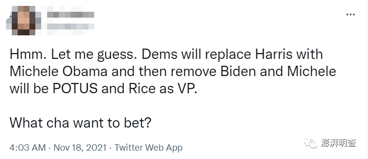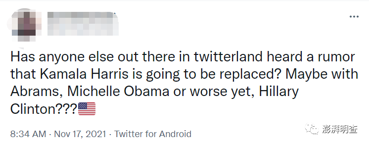 “有没有推友听说一则传闻,卡玛拉·哈里斯要被撤换了?可能上任的有艾布拉姆斯、米歇尔·奥巴马,或者更糟糕,希拉里·克林顿???”