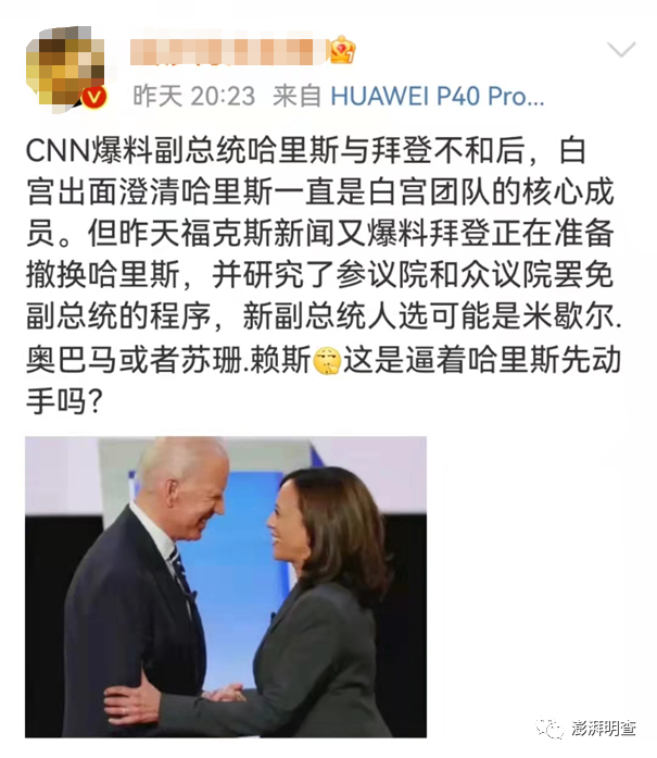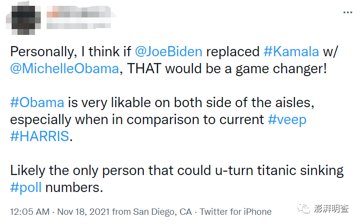 近日,有微博认证用户表示,拜登正在研究罢免副总统的程序,有意撤换哈里斯,而新副总统人选可能是前第一夫人米歇尔·奥巴马,或是前助理国务卿苏珊·赖斯。后两者皆为非裔女性。