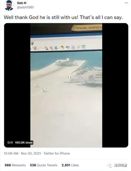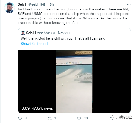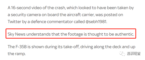 30日,一个自称为英国海军分析师、国防部评论员的推特用户@sebh1981公开了一条16秒的视频,暗示是F-35B失事前的现场监控录像。