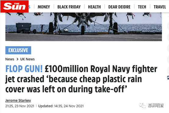 不甘等待的媒体于是选择主动寻找线索。11月23日,英国媒体《太阳报》从舰船上的水手处得到独家消息,称这架价值1亿英镑的皇家战斗机坠海很有可能仅仅是由一个廉价的塑料盖导致的。