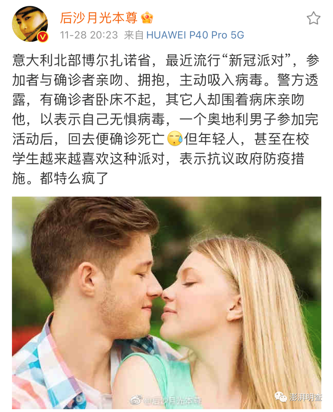 近日,有用户在微博上指出,“新冠派对”近来成为意大利北部博尔扎诺省新风尚。在这种“新冠派对”上,参加者与确诊者亲吻、拥抱,主动吸入病毒。一名奥地利男子参加完活动后,回去便确诊死亡。该微博用户称,人们参加这种派对,是为了抗议政府防疫措施。