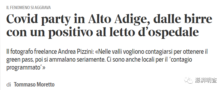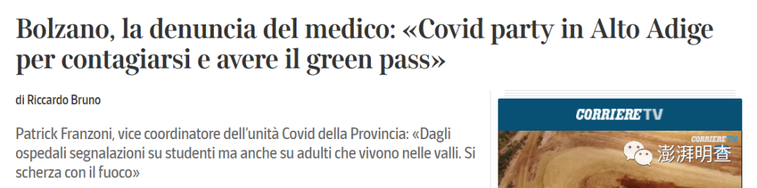 当地时间11月19日,威尼托邮报(Corriere del Veneto)发布题为《博尔扎诺,医生抱怨:举行“新冠派对”,感染以获得绿色通行证》文章,提到了“新冠派对”这一现象。该文引述当地卫生部门抗疫小组负责人帕特里克·弗兰佐尼(Patrick Franzoni)的话表示,当地医院多位医务人员可以证实,不只一名患者承认自己是主动被感染的——此举是为了产生抗体,在不接种疫苗的情况下获得绿色通行证(green pass)。