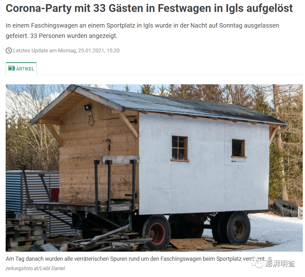 奥媒Tiroler Tageszeitung今年1月25日报道,33人违反防疫政策,在伊格尔斯(Igls)参加了一场“新冠派对”,被当地警方驱散。