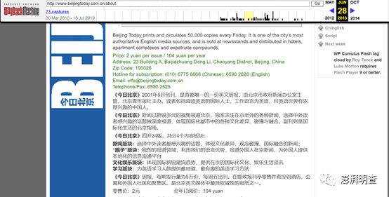 这些历史资料中,有一份留存于2013年6月28日的页面记录,显示的是《今日北京》在2009年2月4日更新的自我介绍(about us)。其中提到 “《今日北京》2001年5月创刊,是首都唯一的一份英文周报,由北京市政府新闻办公室主管,北京青年报社主办。”