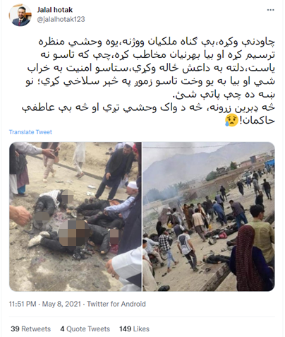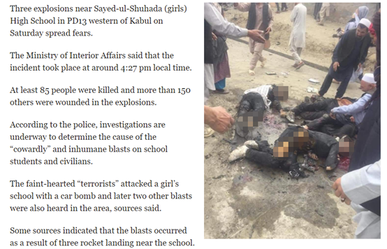 一家自称为阿富汗最大英语新闻服务机构的线上通讯社“钢笔”(Kuaama Press)在当地时间5月8日下午7点13分发布文章称,阿富汗首都喀布尔西部的一所女子高中附近发生了三次爆炸,造成了至少85人死亡,数十人受伤。该图片被作为现场照片出现在文中,未作模糊化处理。