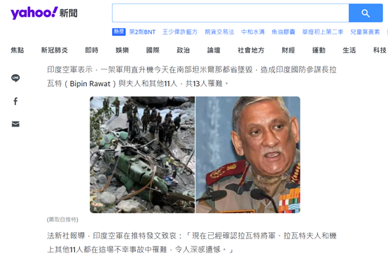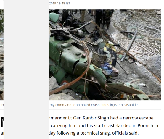 雅虎新闻所使用的所谓现场照片早在2019年就已经出现。据印度电视网络“今日印度”报道,2019年10月24日,印度斯坦航空公司(HAL)在前德国MBB公司协助下研发的一架“北极星”直升机因“技术故障”在克什米尔坠毁,机上载有时任印度北部军区司令兰比尔·辛格。幸运的是,包括该司令在内的机上9人全部存活了下来,仅遭受了轻伤。