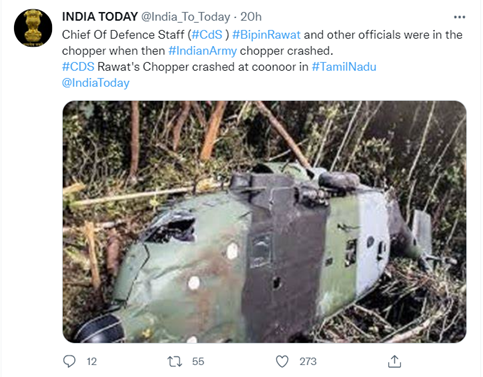 一个今年4月刚注册的推特账号@India_To_Today在8日下午发布了另一张显示在灌木丛中侧翻的直升机坠机图。