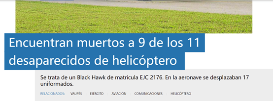至于@India_To_Today发布在推特上的图片,表现的则是发生在哥伦比亚境内的一起坠机事故。据哥伦比亚当地媒体《时代报》(Eltiempo)报道,当地时间2020年7月21日,一架载有17位士兵的军用UH-60黑鹰直升机在哥伦比亚东南部伊尼里达(Inírida)河岸边坠毁,事故造成至少9人死亡,6人受伤。新华网英语新闻对此事亦有报道。