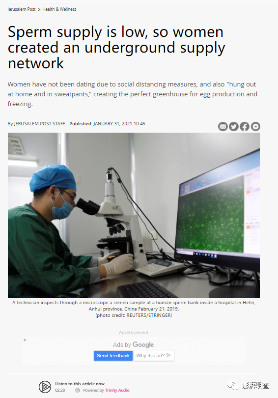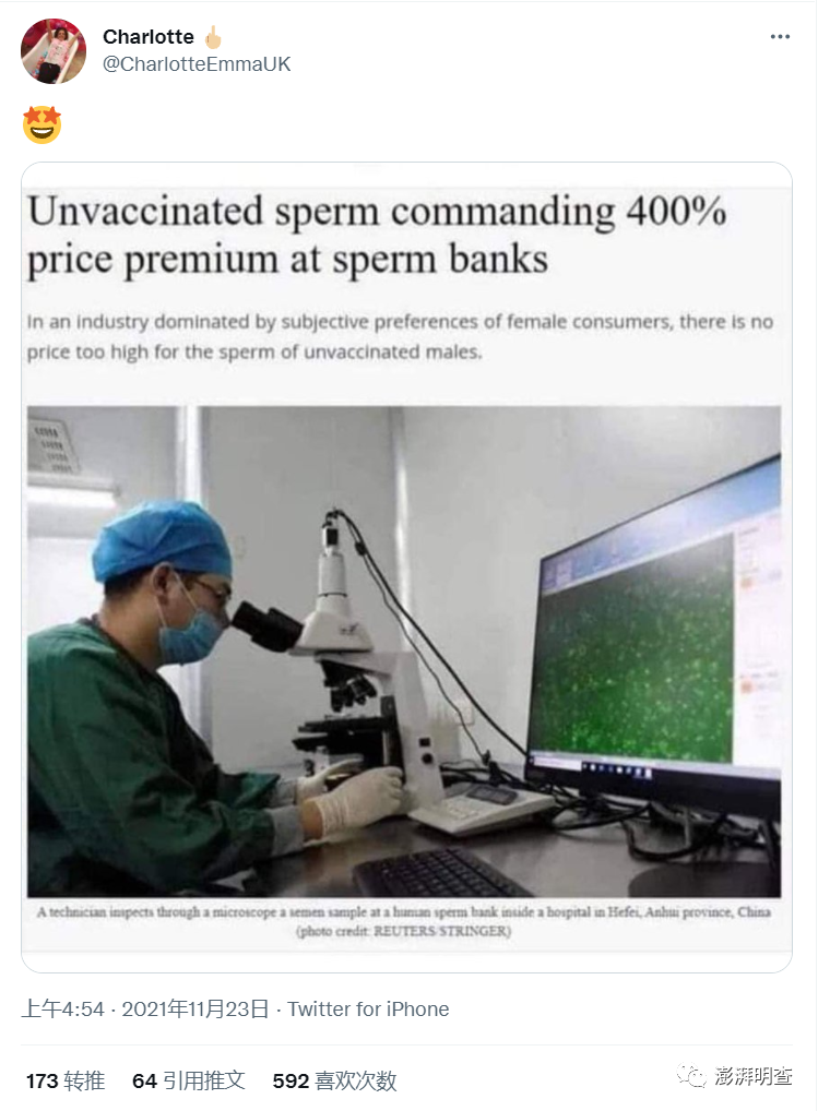 近日,有网友在推特上放出一张新闻网站截图,标题为“未接种疫苗的精子在精子库中获得400%的涨价”。截图中的“报道”称,“在一个由女性消费者的主观偏好主导的行业中,未接种疫苗的男性精子,多高价格都不算过高。”配图中,安徽省合肥市某医院的工作人员使用显微镜观察精子样本。该图片署名为路透社的斯特林格(Stringer)。