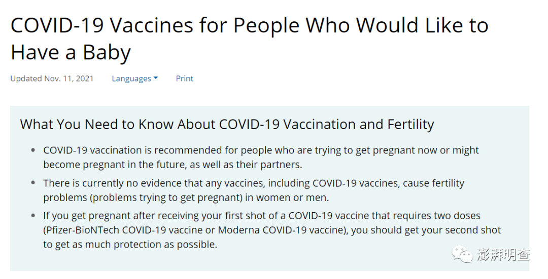 美国疾病控制和预防中心(CDC)11月11日更新通知,“建议正在备孕或将来可能怀孕的人以及伴侣接种新冠疫苗。目前没有证据表明任何疫苗,包括新冠疫苗,会导致女性或男性的生育问题。”