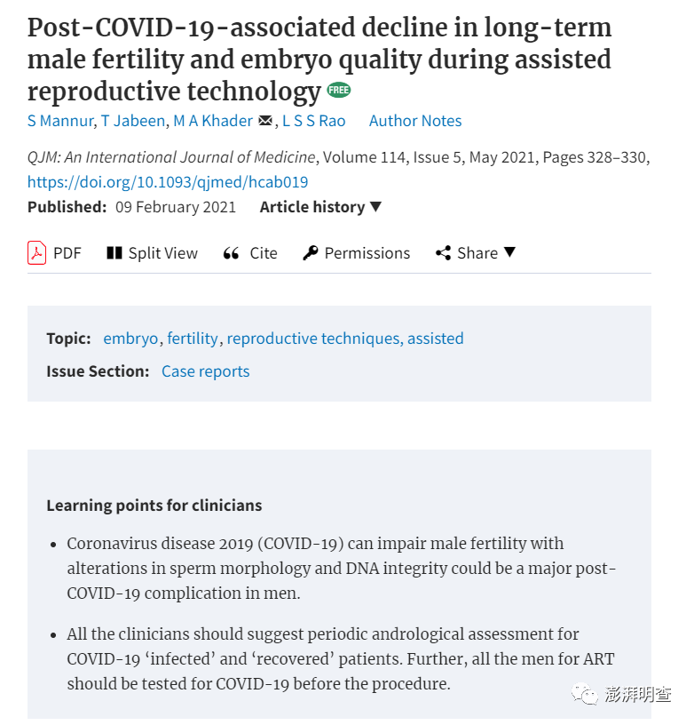 2021年5月,印度科学家在牛津出版社《QJM:国际医学杂志》(QJM: An International Journal of Medicine)上发表论文称,新冠能通过改变精子形态和遗传DNA的完整性来损害男性生育能力。