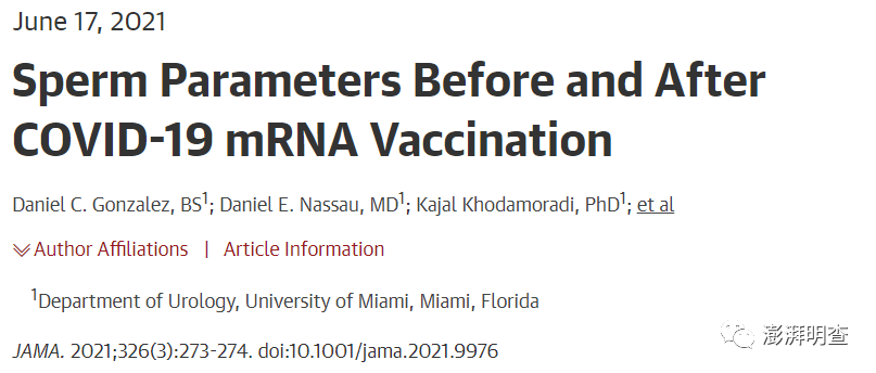 2021年6月,迈阿密大学米勒医学院团队(Miller School of Medicine)在《美国医学会杂志》(JAMA)上发表论文,称对45名健康育龄男性的观察数据显示,接种mRNA疫苗前后,观察对象的精子参数没有显著下降。