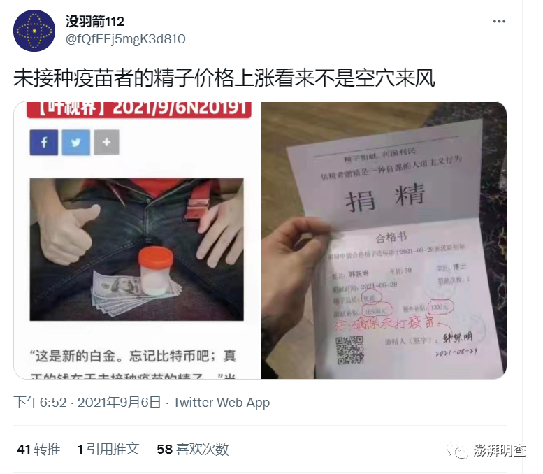早在今年9月,社交网络上就流传一种说法称,没打疫苗的男性精子价格上涨210倍,赶超比特币。