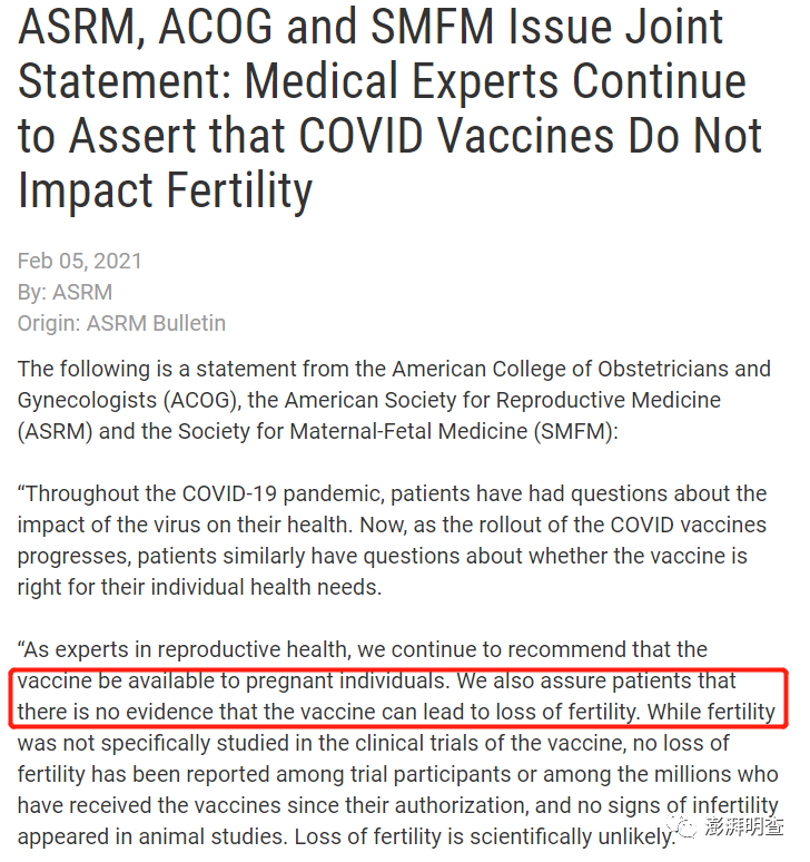美国妇产科学院(ACOG)、美国生殖医学会(ASRM)和母胎医学学会(SMFM)于2021年2月发表联合声明指出,没有任何证据表明疫苗会导致生育能力丧失。