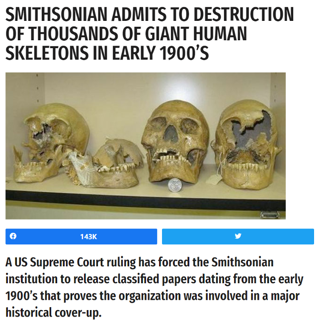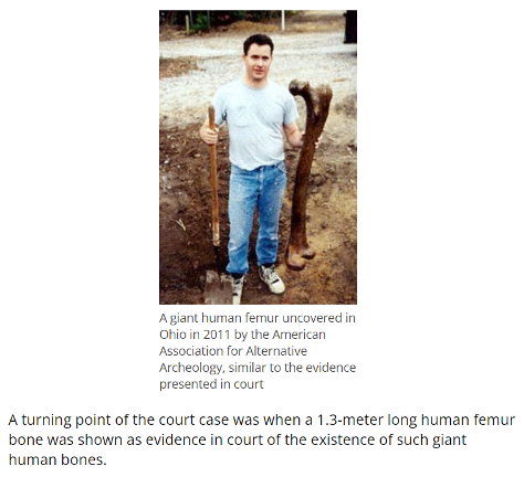 根据这篇报道的说法,一开始,史密森尼学会拒不承认销毁巨人骸骨,但是,AIAA展示了一根1.3米长的人类股骨,成为关键性证据。文章还插入了一张据称是2011年在美国俄亥俄州发掘的巨型人骨。