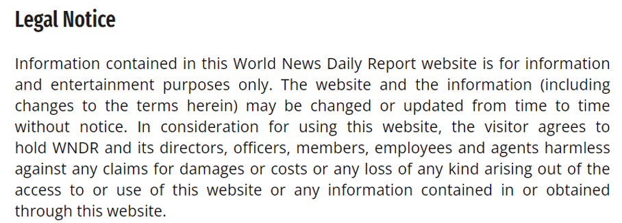 在详情页面的“法律通知”一栏,该网站的免责声明写道:本“世界新闻每日报道”网站信息仅供参考娱乐。