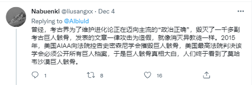 在这条推文下方,有用户@liusangxx 回复道,“曾经,考古界为了维护进化论正在迈向主流的‘政治正确’,毁灭了一千多副巨人骸骨,发表的文章一律攻击为造假,就像消灭异教徒一样。2015年,美国AIAA向法院控告史密森尼学会摧毁巨人骸骨,美国最高法院判决该学会必须公开所有巨人档案,于是巨人骸骨真相大白,人们终于看到了莫哈韦沙漠巨人骸骨。”