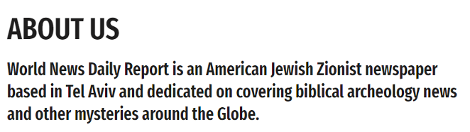 其实,仔细观察可以发现,其标志上除了“World News Daily Report”几个大字外,还有一行小字:Where facts don't matter (事实不重要的地方)。其自称“位于特拉维夫的美国犹太人犹太复国主义报纸”、“致力于发掘世界范围内的圣经考古新闻和其他神秘事件。”
