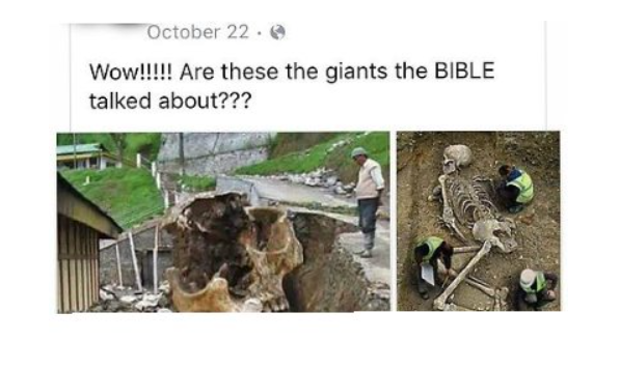 近日,有用户在推特上以英文及繁体中文同时发推称,“世界上已发现2万多个巨人化石,但主流媒体刻意隐瞒”。随文配图一副埋在土中的人类骨骼,有三个身着荧光绿的疑似考古工作人员蹲在骨骼旁进行勘察。和三位工作人员比起来,这副人骨显得巨大无比。