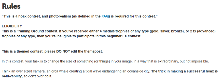 该竞赛主题为“尺寸很重要”(Size matters 4),规则要求参赛者“以非同寻常但并非不可能的方式更改图像中物品的大小”。