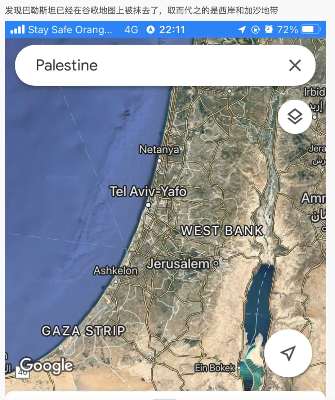近日,微信群流传一张截图称,“发现巴勒斯坦已经在谷歌地图上被抹去了,取而代之的是西岸和加沙地带。”