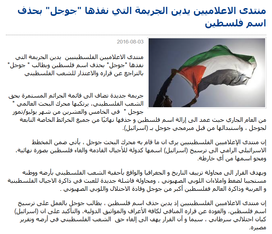 《巴勒斯坦记者论坛谴责“谷歌”删除巴勒斯坦名称》