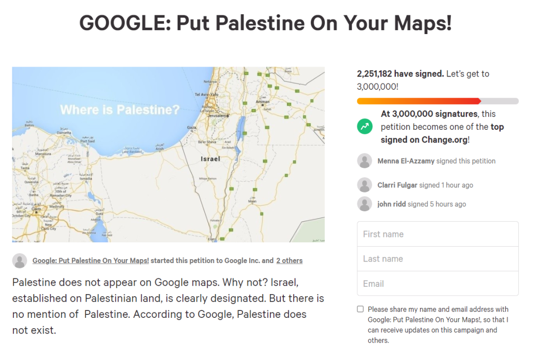 谷歌地图没有收录“巴勒斯坦”这一标签。2016年,扎克·马丁发起联名请愿运动,要求谷歌地图“承认巴勒斯坦”;同年,“巴勒斯坦记者论坛”谴责谷歌地图“伪造历史”。