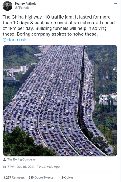 12月19日,有推特用户发布图片消息称,中国“110号公路”大堵车,连堵10余天,车辆每天只能向前行进约1公里。