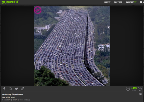 使用谷歌搜图工具反搜相关图片,可知此图在互联网上传播的时间其实已长达十余年。可查询到的最早记录显示,2007年12月9日,一家荷兰在线视频平台和图像共享网站Dumpert 上传了这张图片,配文称“解决堵车问题,(需要)更多的沥青”。