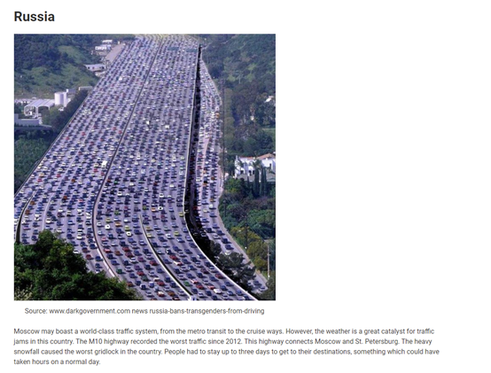 例如,一家名为Carro.sg的网站在介绍世界上最糟糕的堵车记录时使用了该图片。相关文字称,M10号打破了2012年以来最糟糕的交通状况记录,这条公路因严重的积雪被封锁。人们被迫在公路上等待了3天才到达目的地,而通常情况下这趟路程只需花费几小时时间。