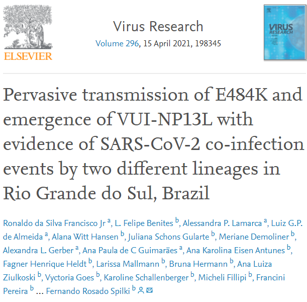 《病毒研究》(Virus Research)今年4月刊登的论文。结果显示,新冠的两种不同毒株(B.1.1.28和VUI-NP13L)可以同时感染。