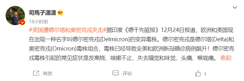 昨日,有网友在社交平台上表示,欧美如今又出现一种名为德尔密克戎(Delmicron)的新变异毒株。据称,这种新毒株是德尔塔和奥密克戎的两种变异毒株的组合。