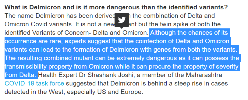 12月22日,印媒《北方新闻》(The Northern News)刊文《英美激增病例后的“德尔密克戎”,而不仅仅是奥密克戎》('Delmicron', not just Omicron, behind surge in cases in UK, US),援引马哈拉施特拉邦新冠工作组成员沙山克·乔希(Shashank Joshi)博士的话写道:“德尔密克戎——德尔塔和奥密克戎的双峰——在欧洲和美国已经导致了一场小型的病例‘海啸’。”
