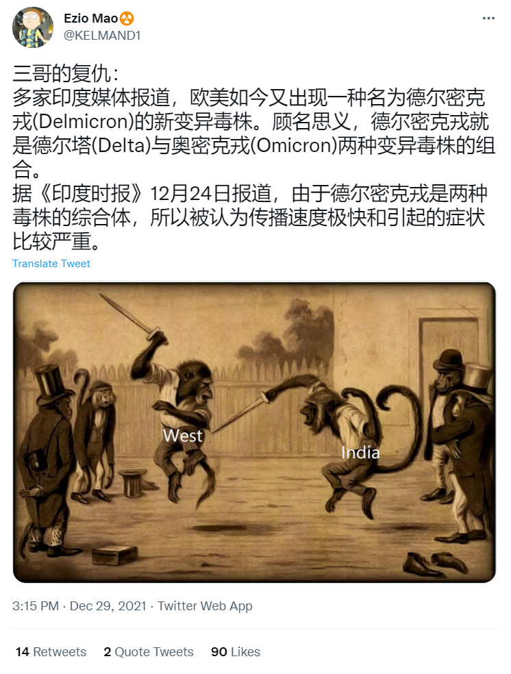 有印媒将之解释成结合德尔塔和奥密克戎特性的毒株。但目前,世界范围内未发现有这种意义上的“德尔密克戎”变异毒株。
