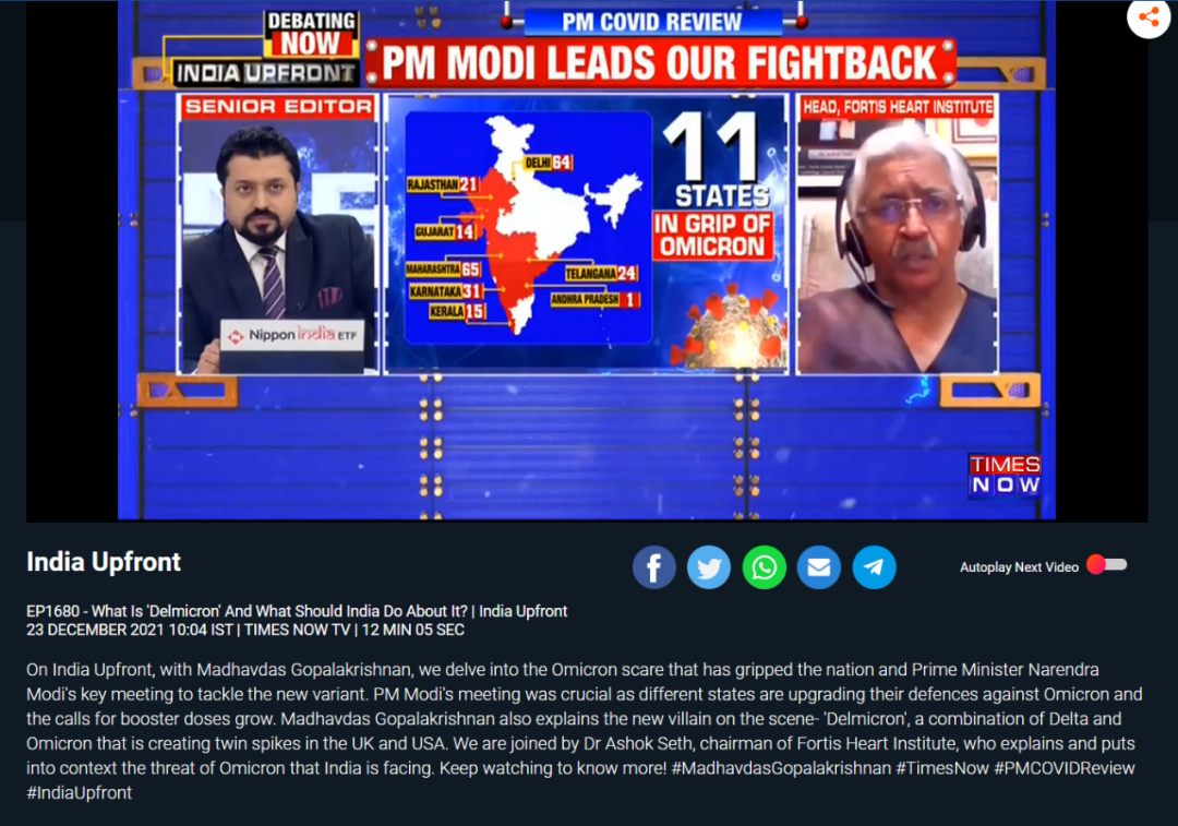 12月23日,印度时报电视台(Times Now TV)节目印度前线(India Upfront)邀请富通心脏研究所(Fortis Heart Institute)主席阿绍克·塞斯(Ashok Seth)博士对“德尔密克戎”进行解读。所谓“德尔密克戎在欧美肆虐”,指的就是欧洲和美国同时面临激增的德尔塔病例和奥密克戎病例。