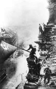以色列犹太大屠杀纪念馆(Yad VaShem)网站对卡尔德伊有详细介绍。卡尔德伊出生于顿涅茨克(Iuzovka,今属乌克兰)的一个犹太家庭,1935年加入苏联国家通讯社塔斯社,成为一名专业摄影师。二战期间,卡尔德伊产出颇丰,捕捉了许多经典瞬间,其中也包括下面这张纳粹德国投降后镰刀旗在柏林街头冉冉升起的照片。