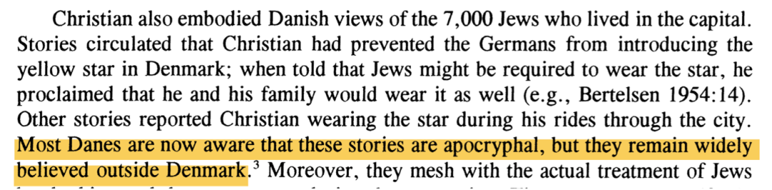 丹麦民众和国王克里斯蒂安十世佩戴黄色大卫星以保护犹太人为杜撰。丹麦犹太人从来没有被要求佩戴任何形式的身份标识。