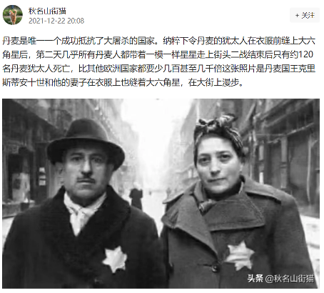近来,中文社交平台上流传一种说法称:“丹麦是唯一一个成功抵抗了大屠杀的国家。纳粹下令丹麦的犹太人在衣服前缝上大六角星后,第二天几乎所有丹麦人都带着一模一样星星走上街头。二战结束后只有约120名丹麦犹太人死亡。”配图中,一对夫妇胸前戴着六角大卫星标识,站在空旷的街道上。