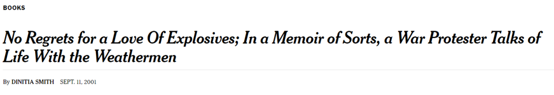 在《纽约时报》2001年9月11日刊登的一篇对艾尔斯新作《逃亡的日子》的书评中,艾尔斯坦诚道:“我不后悔设置炸弹……我觉得我们做得还不够。”